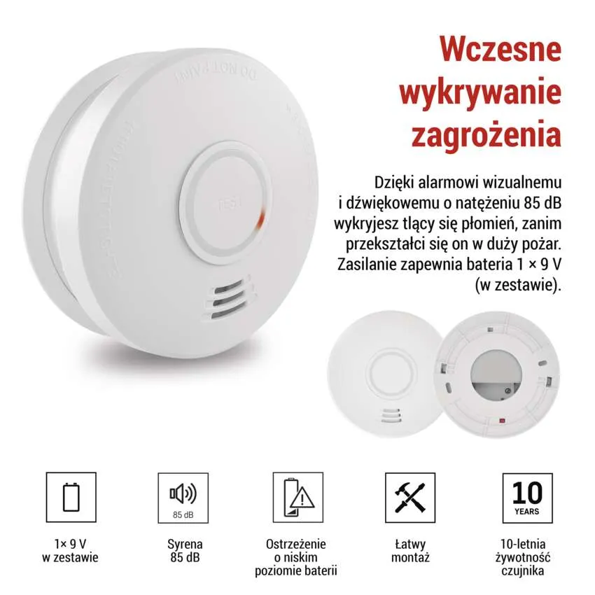 Nasz czujnik dymu został zaprojektowany, aby zapewnić maksymalne bezpieczeństwo i niezawodność. Dzięki alarmom optycznym i dźwiękowym natychmiast ostrzeże Cię o niebezpieczeństwie. Głośny alarm 85 dB jest idealnym wyborem nawet dla większych przestrzeni, zapewniając, że zawsze zostaniesz poinformowany na czas. Czujnik ten charakteryzuje się niskimi kosztami eksploatacji i długą żywotnością czujnika wynoszącą do 10 lat. Nowoczesny i elegancki design pasuje do każdego wnętrza.