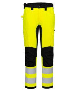 Spodnie ochronne o wysokiej widoczności z właściwościami recyklingowymi, elastycznymi panelami i wieloma kieszeniami łączą widoczność, wygodę i funkcjonalność. Wykonane z ekologicznych materiałów, oferuje elastyczność i łatwość poruszania się, zapewniając jednocześnie dużo miejsca na narzędzia i niezbędne rzeczy. Idealne dla aktywnych środowisk pracy łacząc wydajność i zrównoważony rozwój.