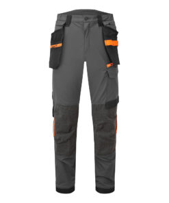 Spodnie robocze EV4 z kaburami mają ulepszoną ergonomiczną konstrukcję i wykorzystują specjalnie rozmieszczone otwory wentylacyjne, aby zapewnić maksymalny komfort podczas pracy. Spodnie mają wysoki stan z elastycznymi bocznymi wstawkami, co zapewnia ochronę we wszystkich pozycjach roboczych. Wstępnie wygięte, regulowane kieszenie na nakolanniki, obszerne kieszenie przednie i wielofunkcyjne kieszenie na udach z zamkiem błyskawicznym zapewniają bezpieczne przechowywanie telefonu, długopisów i narzędzi. Potrójne szwy zapewniają maksymalną trwałość.