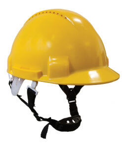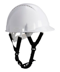 Wentylowany hełm ochronny przystosowany do pracy na wysokości. Wysoki komfort noszenia. Skorupa z polietylenu, sześć punktów więźby i regulacja klamrą.