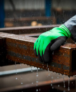 Rękawice ochronne X-HYDROS GREEN wykonane z dzianiny poliestrowej, powlekane w całości lateksem w kolorze zielonym. Dodatkowe oblanie z czarnego spienionego lateksu w części chwytnej zapewnia doskonałą przyczepność nawet w przypadku mokrych powierzchni oraz nieprzemakalność, co przekłada się na większy komfort użytkowania. Rozciągliwe i elastyczne. Zakończone ściągaczem. Opakowanie 240 par. CE KAT I. Dostępne w rozmiarach: 9 , 10.