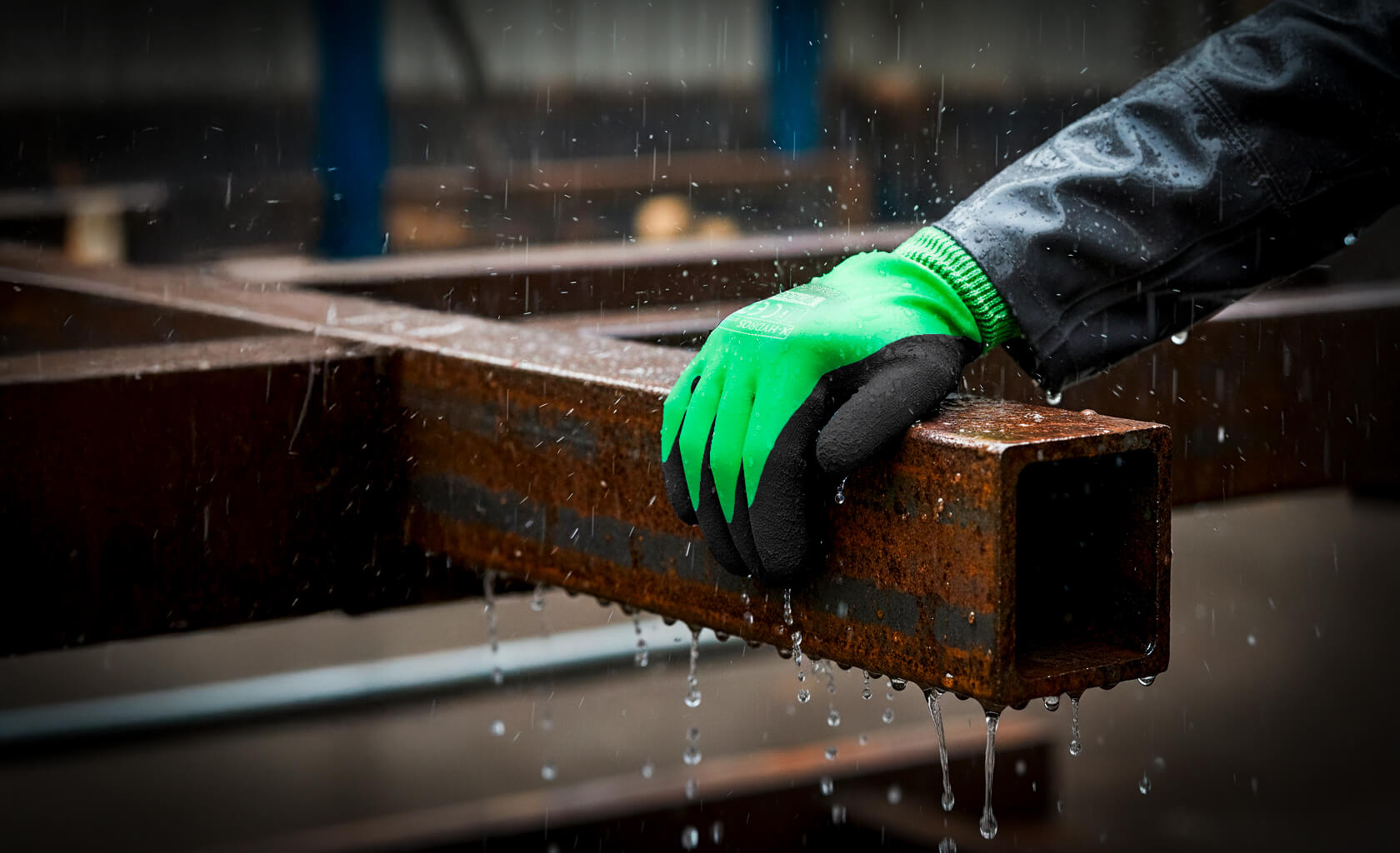 Rękawice ochronne X-HYDROS GREEN wykonane z dzianiny poliestrowej, powlekane w całości lateksem w kolorze zielonym. Dodatkowe oblanie z czarnego spienionego lateksu w części chwytnej zapewnia doskonałą przyczepność nawet w przypadku mokrych powierzchni oraz nieprzemakalność, co przekłada się na większy komfort użytkowania. Rozciągliwe i elastyczne. Zakończone ściągaczem. Opakowanie 240 par. CE KAT I. Dostępne w rozmiarach: 9 , 10.