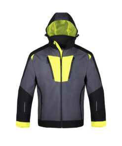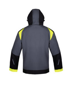 Kurtka sofshell (100% poliester) w kolorze szarym z czarnymi wstawkami oraz żółtymi i odblaskowymi elementami dla poprawy widoczności. Dwie kieszenie piersiowe oraz kieszenie boczne zapinane na suwak. Odpinany kaprur z podszewką z żółtej siatki i z regulacją obwodu za pomocą stoppera. Obwód rękawów regulowany na rzep, zapewniając lepsze dopasowanie. W dolnej części rękawów wszyta odblaskowa lamówka. Produkt spełnia wymogi normy PN-EN ISO 13688:2013. Pakowanie: 1/10 karton.