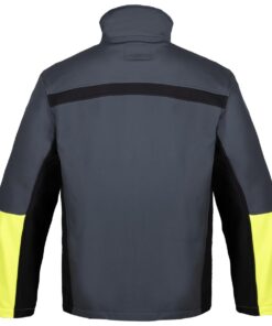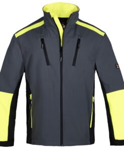 Kurtka softshell (100% poliester) w kolorze ciemnoszarym z czarnymi i żółtymi wstawkami. Czarne wstawki po bokach i w spodniej cześci rękawa. Żółte wstawki w dole rękawów oraz na barkach. Dwie kieszenie piersiowe zamykane na zamek w kolorze czarnym. Kieszenie boczne zamykane na zamek w kontrastowym żółtym kolorze. Obwód rękawów regulowany na rzep, zapewniając lepsze dopasowanie. Produkt spełnia wymogi normy PN-EN ISO 13688:2013. Pakowanie: 1/10 karton.