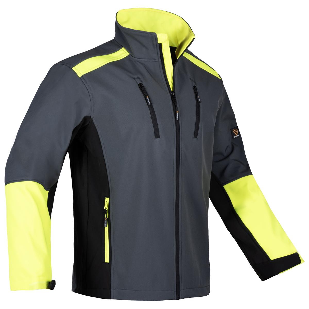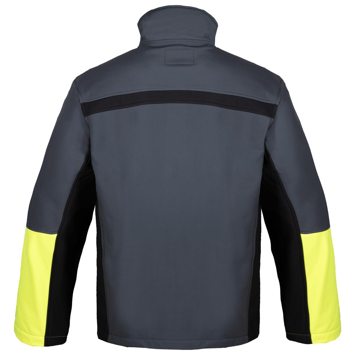 Kurtka softshell (100% poliester) w kolorze ciemnoszarym z czarnymi i żółtymi wstawkami. Czarne wstawki po bokach i w spodniej cześci rękawa. Żółte wstawki w dole rękawów oraz na barkach. Dwie kieszenie piersiowe zamykane na zamek w kolorze czarnym. Kieszenie boczne zamykane na zamek w kontrastowym żółtym kolorze. Obwód rękawów regulowany na rzep, zapewniając lepsze dopasowanie. Produkt spełnia wymogi normy PN-EN ISO 13688:2013. Pakowanie: 1/10 karton.