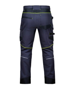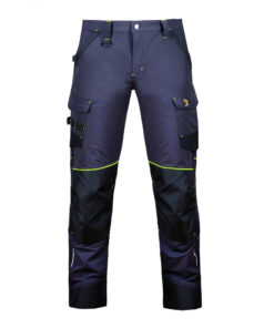 Spodnie wykonane z elastycznej tkaniny 4 way stretch o składzie 92% poliamid i 8% elastan, o gramaturze 240g/m2, w kolorze granatowym z czarnymi wzmocnieniami z tkaniny Oxford oraz neonowo zielonymi lamówkami. Spodnie posiadają dwie naszyte kieszenie boczne z patką, wszywkę na identyfikator, otwartą kieszeń tylną, kieszenie boczne z plisą z tkaniny oxford oraz kieszeń po plisą w tyle. Kieszenie, kolana i doły nogawek wzmocnione tkaniną oxford. Spodnie posiadają zaczepy na narzędzia wszyte przy kieszeniach oraz w szlufce w przodzie. Profilowane kolana zaszewkami, potrójne szwy nogawek wewnętrzne i zewnętrzne, w dole nogawek odblaskowe elementy. Produkt spełnia wymogi normy PN-EN ISO 13688:2013
