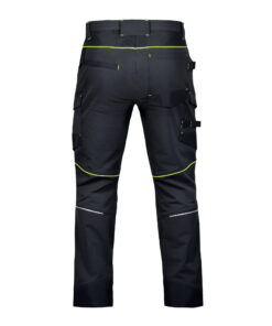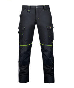 Spodnie wykonane z tkaniny tkaniny 4 way stretch o składzie 92% poliester i 8% spandex, o gramaturze 250g/m2, w kolorze czarnym z czarnymi wzmocnieniami z tkaniny Oxford oraz neonowo zielonymi lamówkami. Spodnie posiadają dwie naszyte kieszenie boczne z patką, wszywkę na identyfikator, otwartą kieszeń tylną, kieszenie boczne z plisą z tkaniny oxford oraz kieszeń po plisą w tyle. Kieszenie, kolana i doły nogawek wzmocnione tkaniną oxford. Spodnie posiadają zaczepy na narzędzia wszyte przy kieszeniach oraz w szlufce w przodzie. Profilowane kolana zaszewkami, potrójne szwy nogawek wewnętrzne i zewnętrzne, w dole nogawek odblaskowe elementy. Produkt spełnia wymogi normy PN-EN ISO 13688:2013